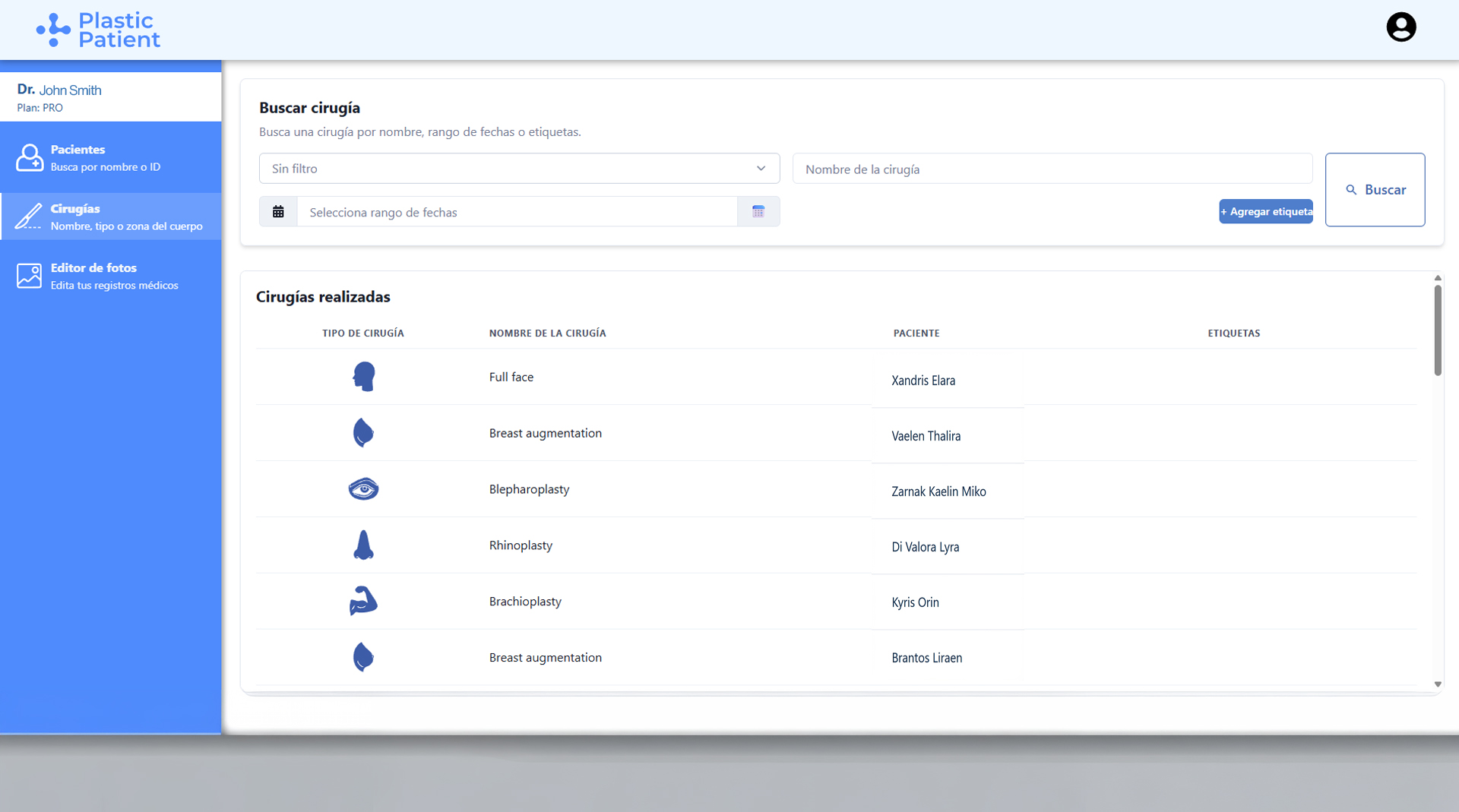 Our intelligent search allows you to find patients by name or ID, and surgeries by procedure type, date, body part, or custom tags. You can also combine multiple filters for precise results.